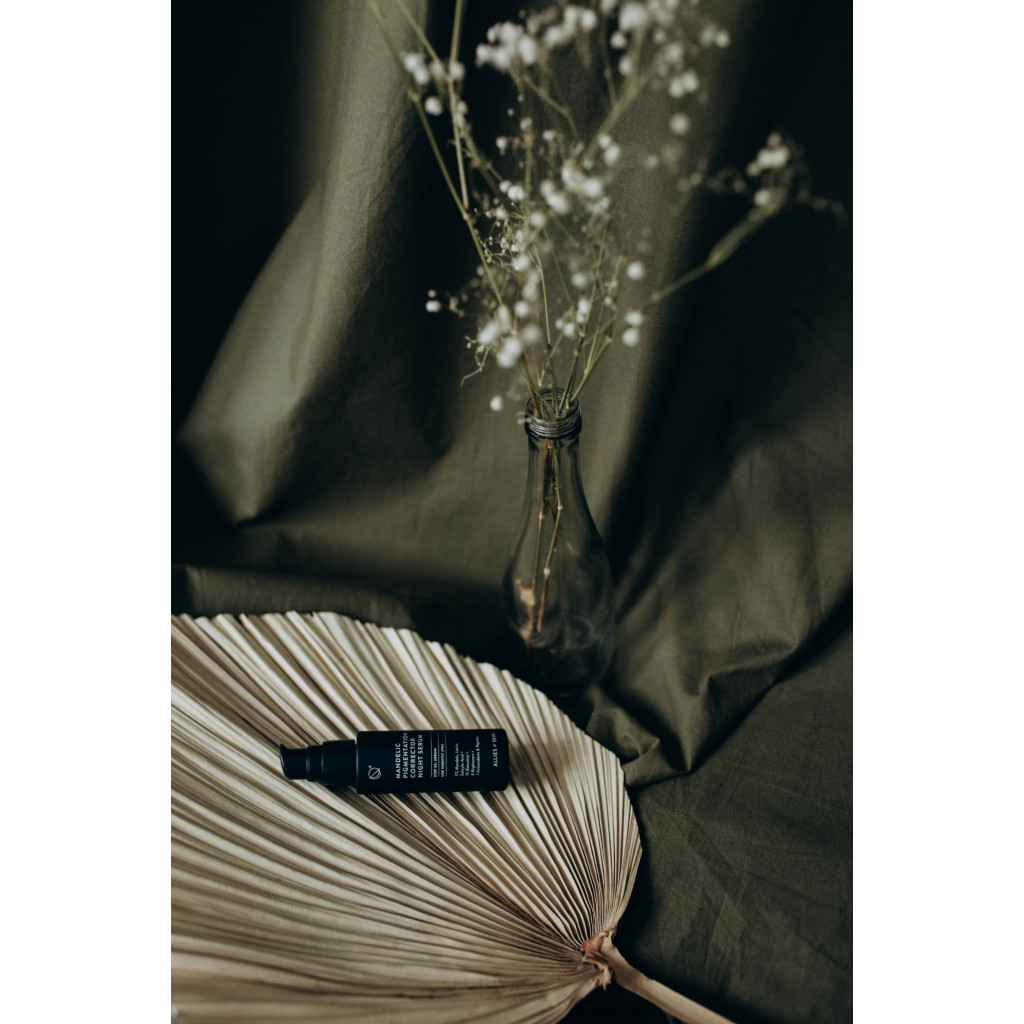 Більшість сироваток AHA мають тенденцію фокусуватися лише на пілінгу, залишаючи шкіру чутливою та сухою. Allies Of Skin Mandelic Pigmentation Corrector Night Serum - сироватка, яка не тільки відлущує, але й відновлює вологу та зміцнює тонкий бар'єр шкіри за допомогою гіалуронової кислоти + ніацинаміду та незамінних жирних кислот з органічної олії шипшини + олії таману. Ацетилтетрапептид-40 призначений для боротьби з почервонінням шкіри, викликаним запаленням, і для зменшення постзапальної гіперпігментації. До складу додано кілька пептидів, які працюють синергетично, інгібуючи вироблення меланіну, в той же час усуваючи стійку пігментацію, тому шкіра звикає і продукт має накопичувальний ефект. Бакучіол і пальмітоїл трипептид-5 зменшують множинні ознаки старіння: вони забезпечують значне зменшення шорсткості та сухості, а також дрібних зморшок та зморшок. Вони також покращують тонус, еластичність, пружність, сяйво та колір шкіри.