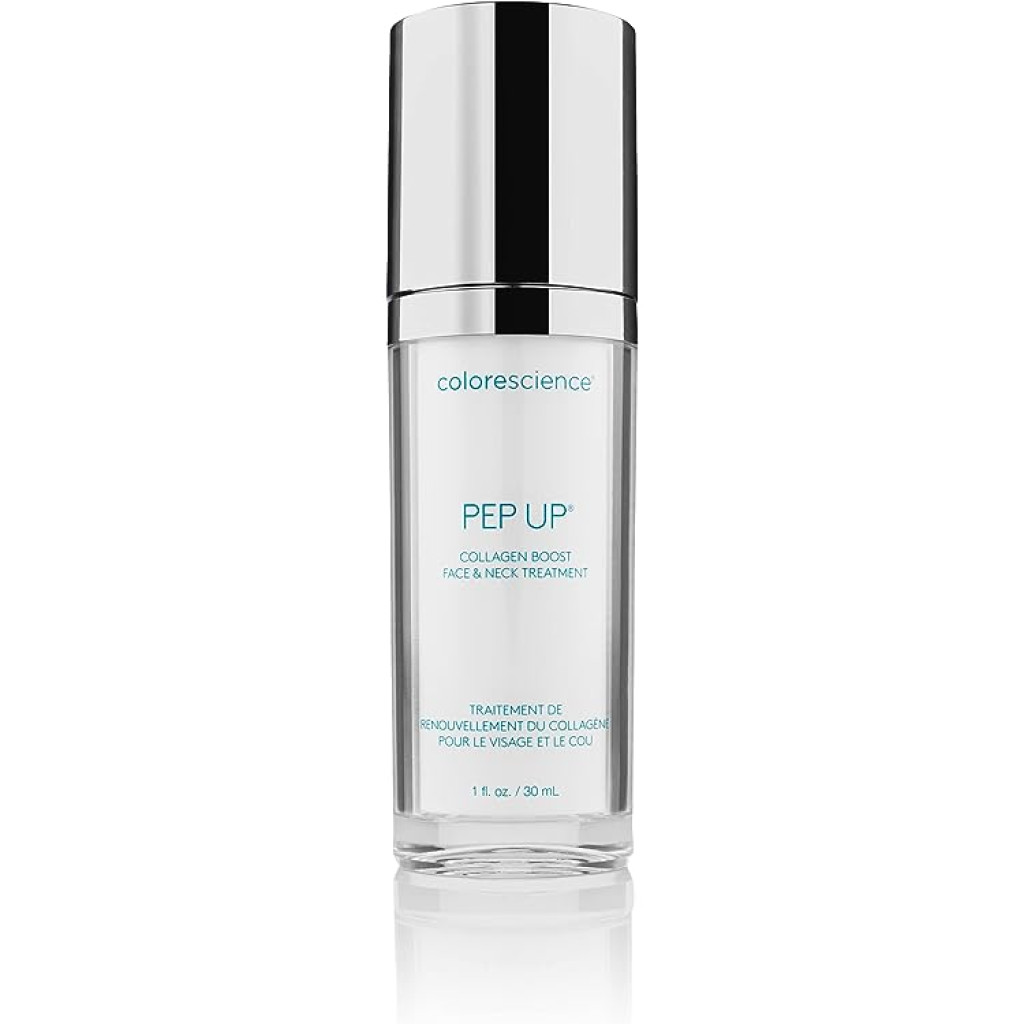 Colorescience Pep Up Collagen Renewal Face&Neck Treatment - крем по догляду за шкірою обличчя, шиї та декольте. Ідеальний продукт для всіх типів шкіри, що містить запатентований комплекс Decaplex-10. У складі комплексу 10 сильнодіючих пептидів, вони допомагають усунути видимі ознаки старіння, посилюючи синтез колагену та еластину. Крем Pep Up® зволожує та відновлює шкіру, покращує тургор, уповільнює старіння, вирівнює тон та рельєф шкіри.