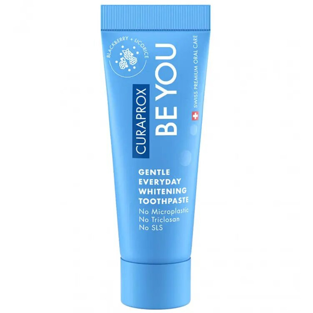 Відбілююча зубна паста Curaprox Be you з кольоровими мікрогранулами і незвичайними яскравими смаками ніжно відбілює зуби, видаляє плями, мінералізує пошкоджену емаль та створює заспокійливий ефект для ясен. Паста містить комплекс натуральних ферментів, що входять до складу слини (лактопероксидазної системи ферментів). Завдяки цьому паста підтримує місцевий імунітет порожнини рота, посилює антибактеріальну, ремінералізуючу, очищувальну дію слини. Не містить SLS (лаурилсульфат натрію), триклозан, парабени, штучні підсолоджувачі, барвники, загусники та консерванти. Завдяки відсутності SLS зубна паста CURAPROX не викликає подразнення слизової оболонки, мінімізує ризик виникнення афтозних виразок, не перешкоджає лікувальному ефекту хлоргексидину.