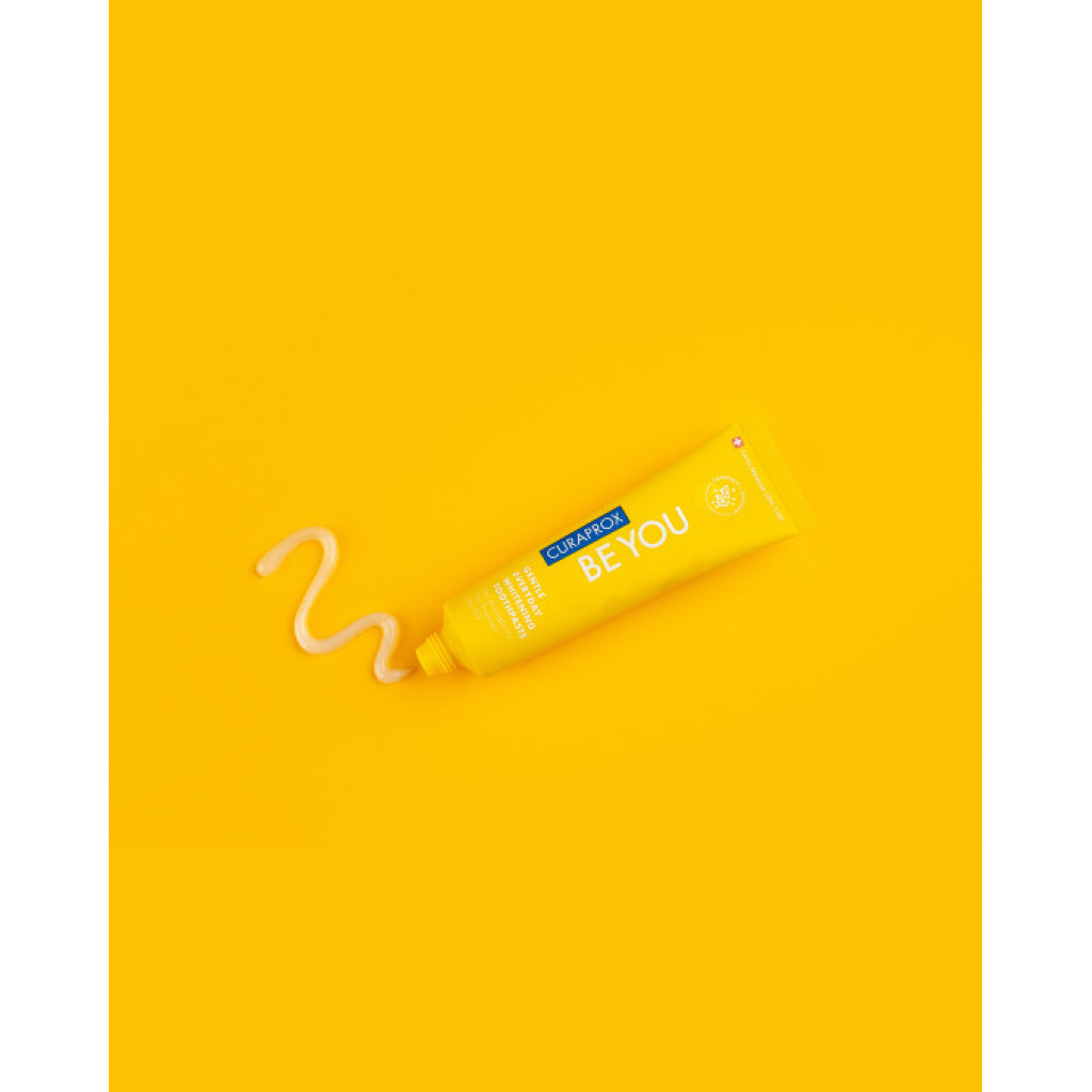 Відбілююча зубна паста Curaprox Be you з кольоровими мікрогранулами і незвичайними яскравими смаками ніжно відбілює зуби, видаляє плями, мінералізує пошкоджену емаль та створює заспокійливий ефект для ясен. Паста містить комплекс натуральних ферментів, що входять до складу слини (лактопероксидазної системи ферментів). Завдяки цьому паста підтримує місцевий імунітет порожнини рота, посилює антибактеріальну, ремінералізуючу, очищувальну дію слини. Не містить SLS (лаурилсульфат натрію), триклозан, парабени, штучні підсолоджувачі, барвники, загусники та консерванти. Завдяки відсутності SLS зубна паста CURAPROX не викликає подразнення слизової оболонки, мінімізує ризик виникнення афтозних виразок, не перешкоджає лікувальному ефекту хлоргексидину.
