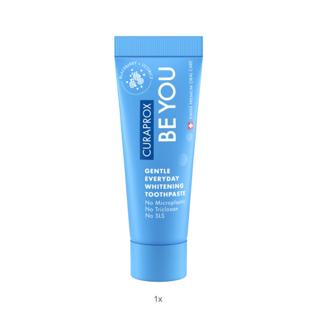 - Curaprox Be you зубна паста 10 мл (ожина + лакриця): захищає зуби і ясна і піклується про них. Ніжно і ефективно відбілює зуби.