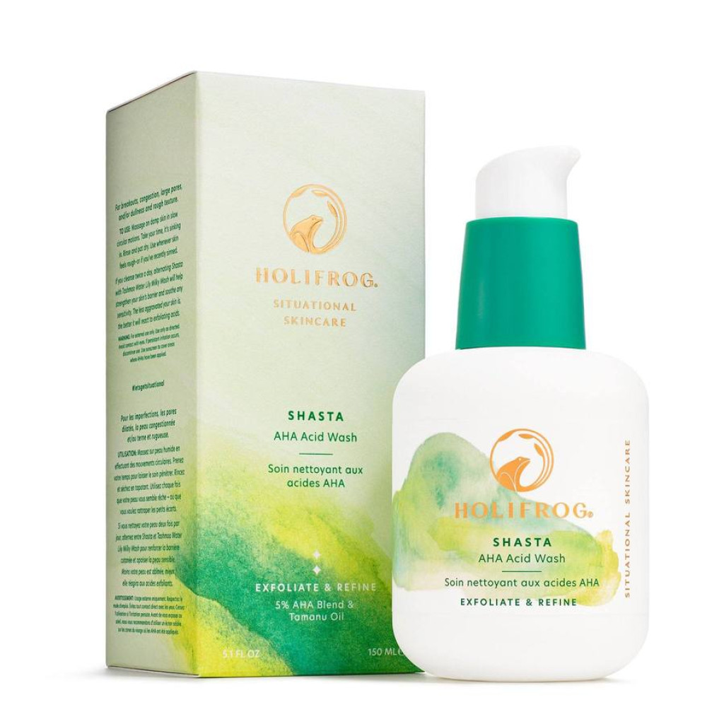 HoliFrog Shasta AHA Refining Acid Wash – гель для вмивання для проблемної та тьмяної шкіри. Дбайливо очищає шкіру від забруднень, відлущує ороговілі частинки, перешкоджає появі акне, вугрових висипань та комедонів. Вирівнює рельєф, робить шкіру гладкою, свіжою та доглянутою.