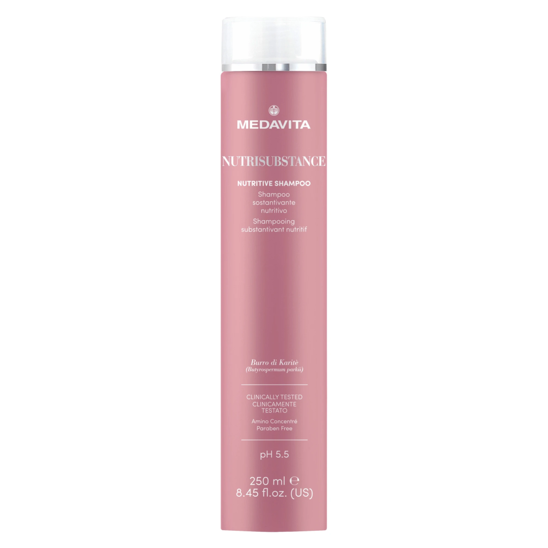 Medavita Nutrisubstance Nutrive Shampoo — живильний шампунь для зміцнення сухого волосся. Зміцнює волокна волосся, має високу концентрацію активних інгредієнтів, які забезпечують зволоження та насичення поживними речовинами навіть під час очищення. Глибоко живить і пом'якшує структуру волосся, огортає довжину та кінчики, робить волосся шовковистим, блискучим та слухняним.