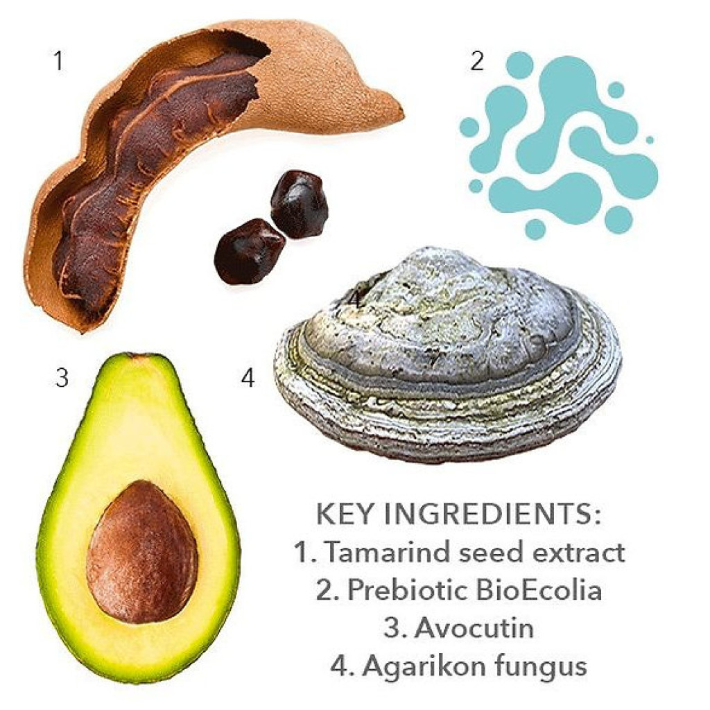 - Пребіотик БіоЕколія® відновлює баланс мікробіому шкіри, живлячи корисну флору.