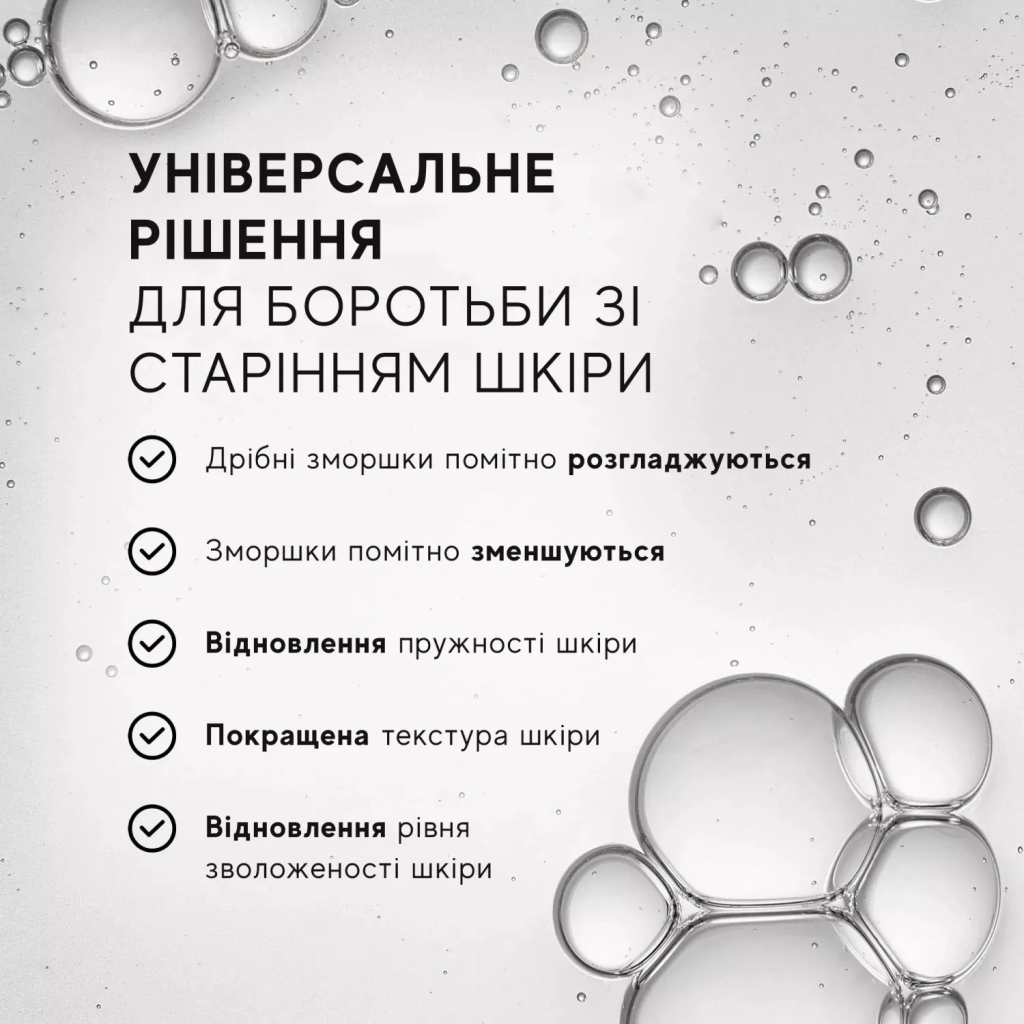 - Глибока гідратація: ультрагідратувальна, кришталево-прозора сироватка з пептидами для обличчя миттєво проникає в шкіру, забезпечуючи ефективність найкращих антивікових технологій.