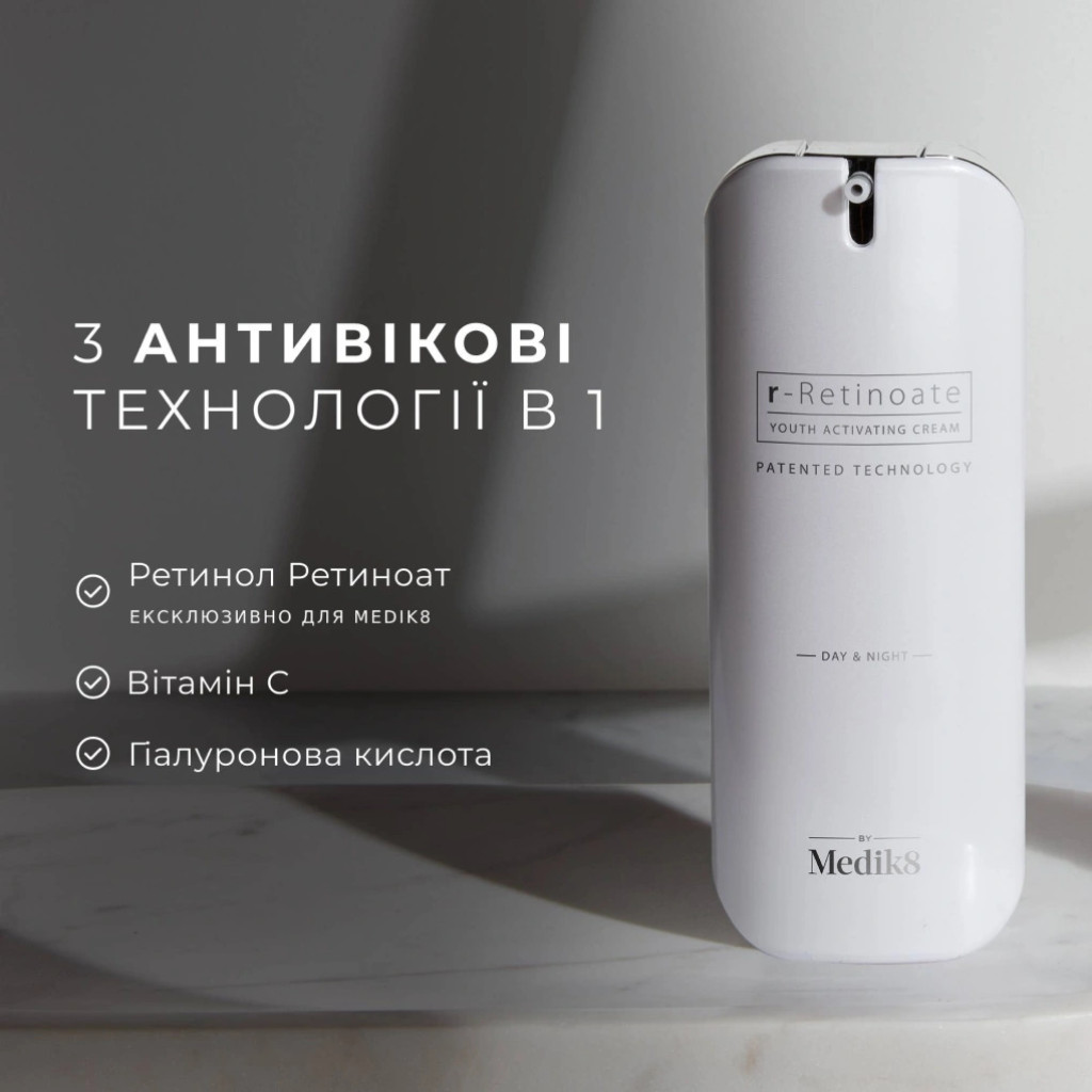 Medik8 R-Retinoate Day&Night — cправжня революція в області антивікового догляду за шкірою. Інноваційний активний інгредієнт був створений завдяки ексклюзивній співпраці Medik8 з корейською суперлабораторією. Цей інгредієнт удостоєний Президентської премії Міністерства охорони здоров'я Кореї.