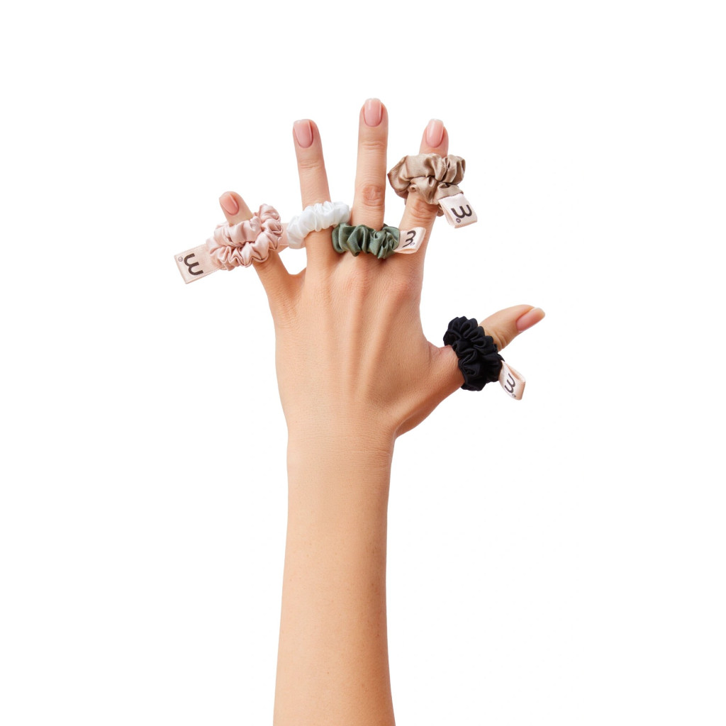 Зменшений формат резинок з натурального 100% шовку трендових кольорів втілює практичність та мінімалізм, бережно фіксує тонке волосся в 2 оберти, мінімізуючи його пошкодження та ламкість.