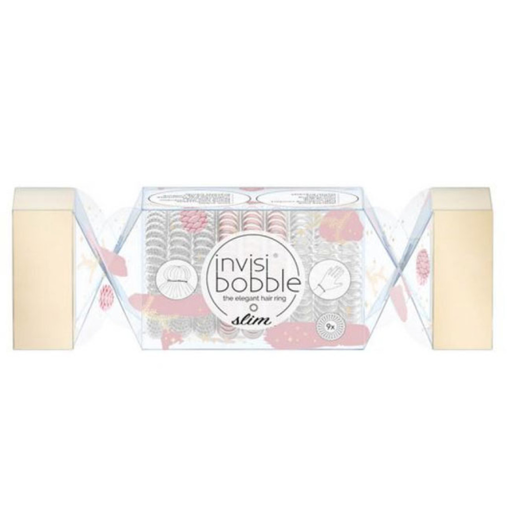 invisibobble® SLIM Trio cracker - подарунковий набір у вигляді різдвяної хлопавки з лімітованої колекції The Wonderfuls. Всередині - дев'ять резиночок-браслетиків формату SLIM (прозорі, бронзові та рожеві). У порівнянні з резиночками ORIGINAL, SLIM мають більшу кількість витків, при цьому меншого розміру, завдяки чому виглядають витонченішими. invisibobble підходять для всіх типів волосся, надійно фіксують зачіску, не залишають заломів і не викликають головний біль. Крім того, invisibobble не намокають і не викликають алергію, оскільки виготовлені зі штучної смоли.
