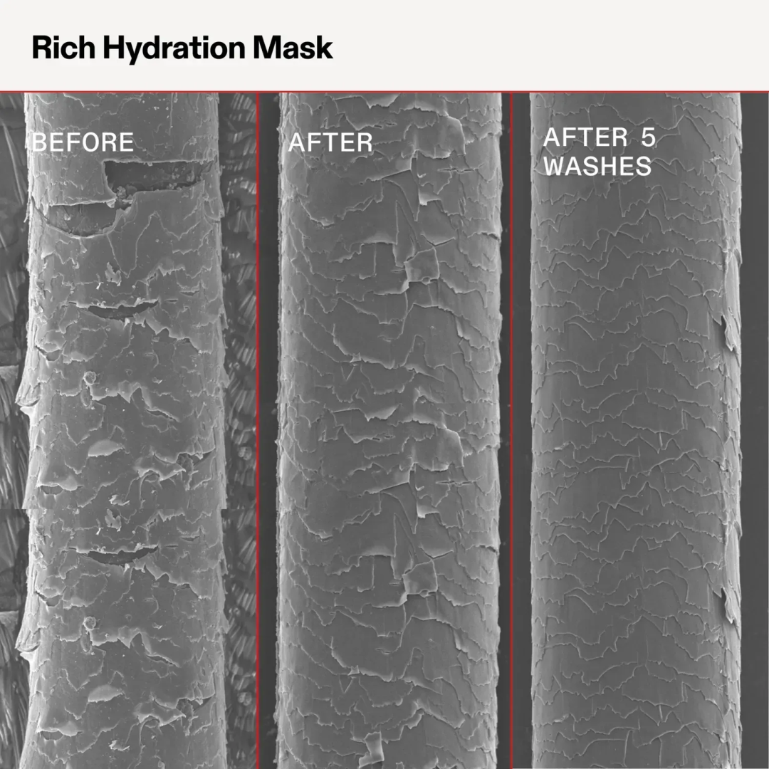 Olaplex Rich Hydration Mask — інтенсивна маска для волосся "Глибинне зволоження". Ця глибоко відновлююча, зволожуюча маска для зневодненого волосся середньої та жорсткої товщини розроблена з використанням біоміметичної технології кутикули, яка забезпечує інтенсивне зволоження та зміцнює волосся, а також закриває кутикулу волосся вже через 5 застосувань, запобігаючи втраті вологи.