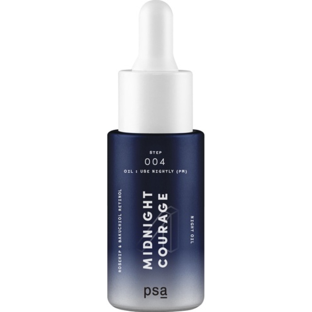 PSA Midnight Courage Rosehip & Bakuchiol Retinol Night Oil - нічне масло з ретинолом. Масло, в якому об'єдналися потужні омолоджуючі, антиоксидантні та протизапальні компоненти. Просто наносите перед сном на фінальному етапі догляду Midnight Courage, щоб побачити, як змінюється стан шкіри - поліпшується текстура, зменшується вираженість зморшок, освітлюється небажана пігментація, йдуть запалення і висипання.
