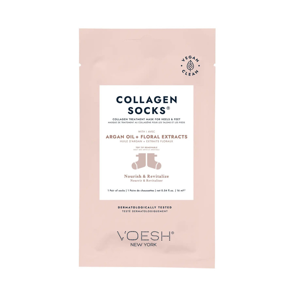 Наповнені веганським колагеном, аргановою олією та квітковими екстрактами, шкарпетки допоможуть відновити м’якість шкіри та додати зволоження.