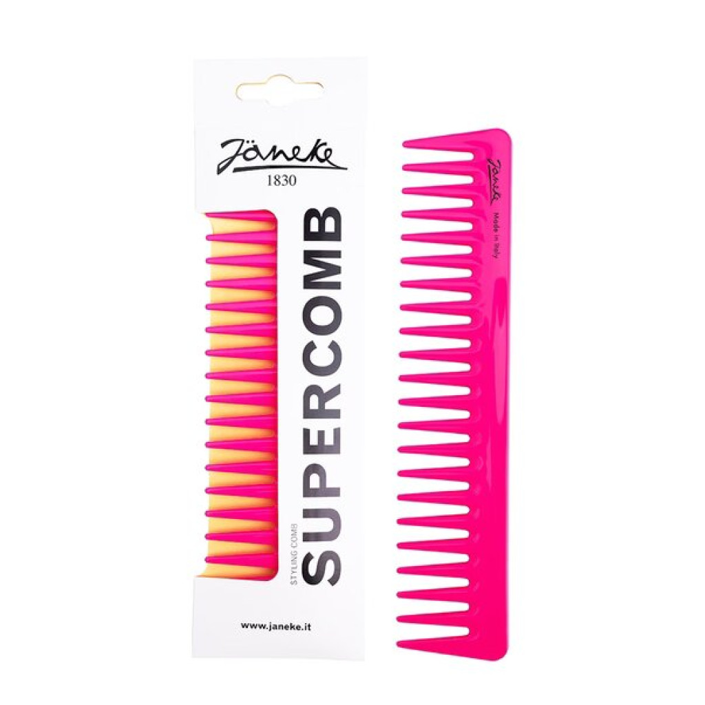 Широкий гребень для волос Janeke с стильным дизайном, эргономичной формой и термостойким прочным пластиком. Он безопасен в использовании, не вступает в реакцию с красками и сохраняет целостность при контакте с водой.