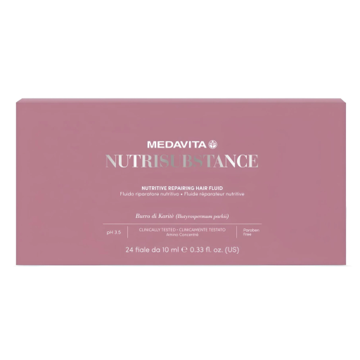 Medavita Nutrisubstance — ультраживильний та відновлювальний флюїд для сухого волосся. Схожість зі структурою волосся дає змогу дорогоцінним інгредієнтам потрапляти саме туди, де волосся найбільше потребує живлення, підвищуючи його захисні сили.