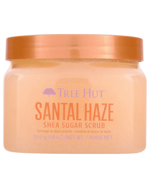 Tree Hut Santal Haze Sugar Scrub — цукровий скраб для тіла з заспокійливим ароматом сандалового дерева та аюрведичною формулою для делікатного відлущування та догляду за шкірою. Продукт містить натуральний цукор для м'якого очищення, екстракти ашваганди, куркуми, імбиру та сандалу для комплексного догляду, а також багату суміш олій для інтенсивного зволоження.